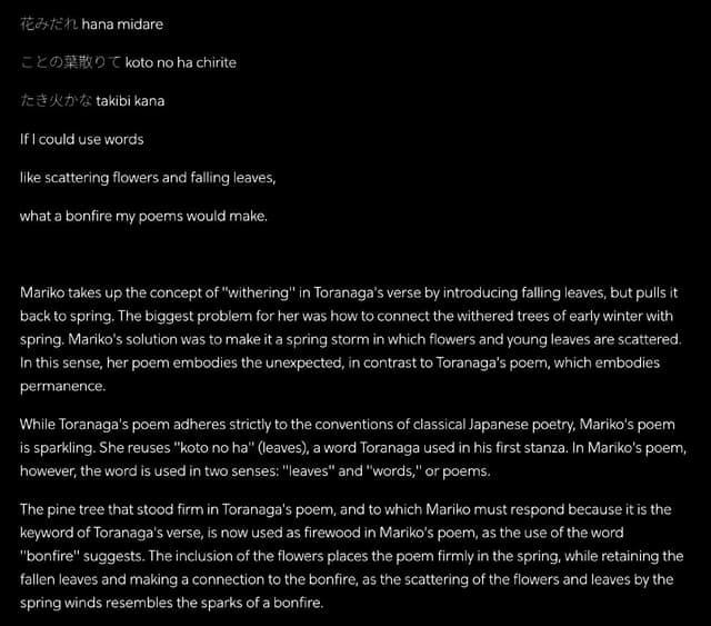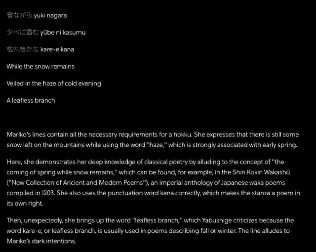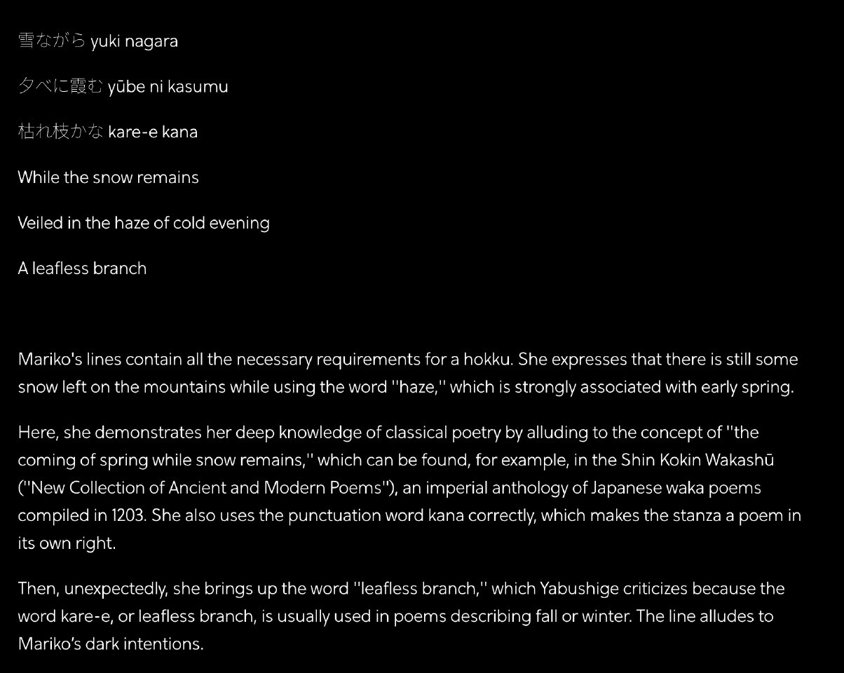 Do you know of the Eightfold Fence [yaegaki]? From the time we are small, it is something we are taught to build within ourselves. An impenetrable wall behind which we can retreat whenever we need. You must train yourself to listen without hearing. For instance, you can listen to the sound of a blossom falling or the rocks growing. If you really listen, your present cirsumstance vanishes. Do not be fooled by our politeness, our bows, our maze of rituals. Beneath it all, we could be a great distance away, safe and alone.