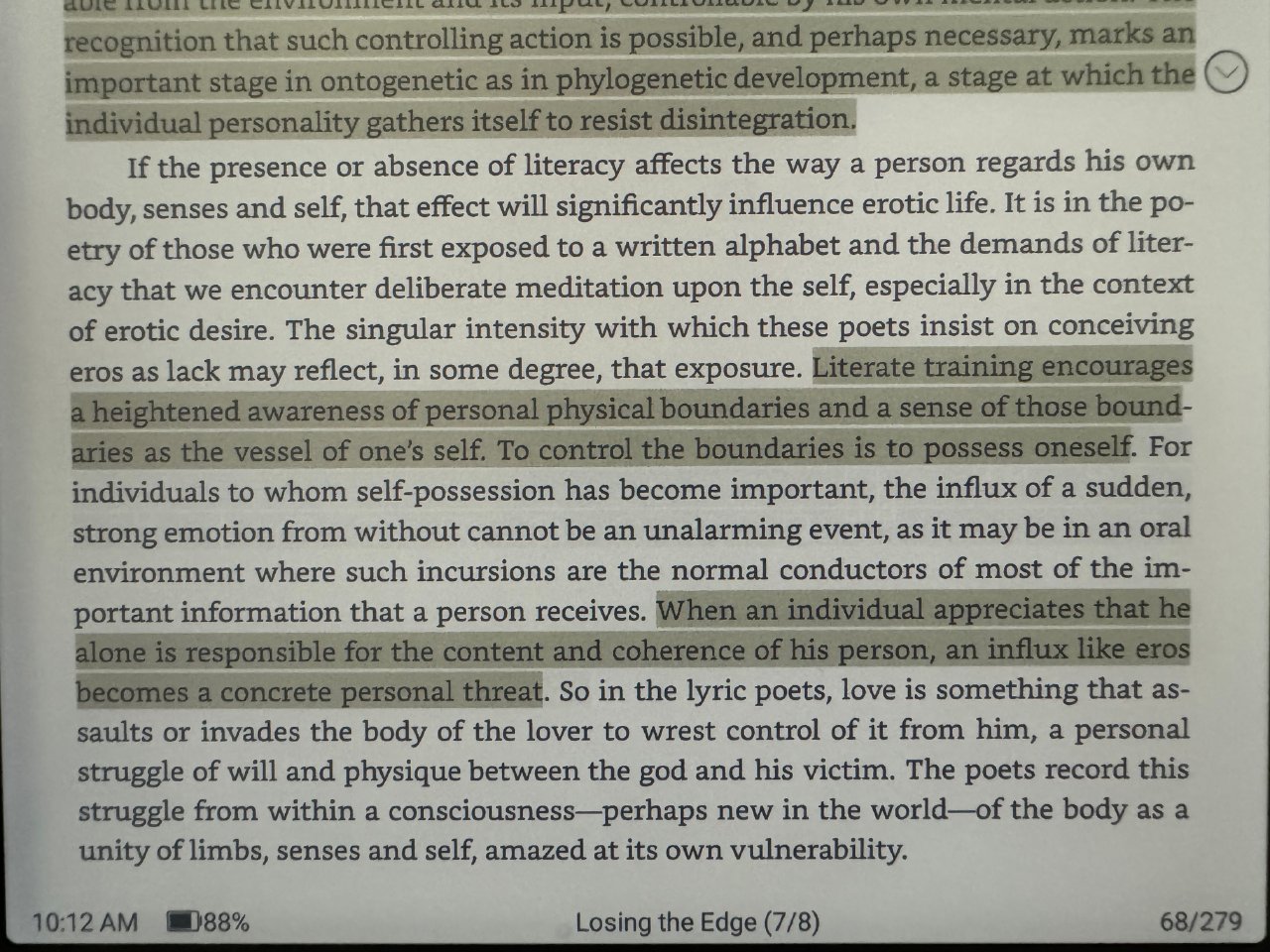 Literate training encourages a heightened awareness of personal physical boundaries and a sense of those boundaries as the vessel of one's self. To control the boundaries is to possess oneself.
