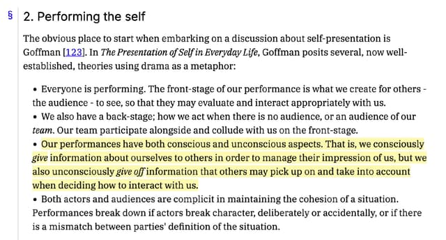 Our performances have both conscious and unconscious aspects. That is, we consciously give information about ourselves to others in order to manage their impression of us, but we also unconsciously give off information that others may pick up on and take into account when deciding how to interact with us.