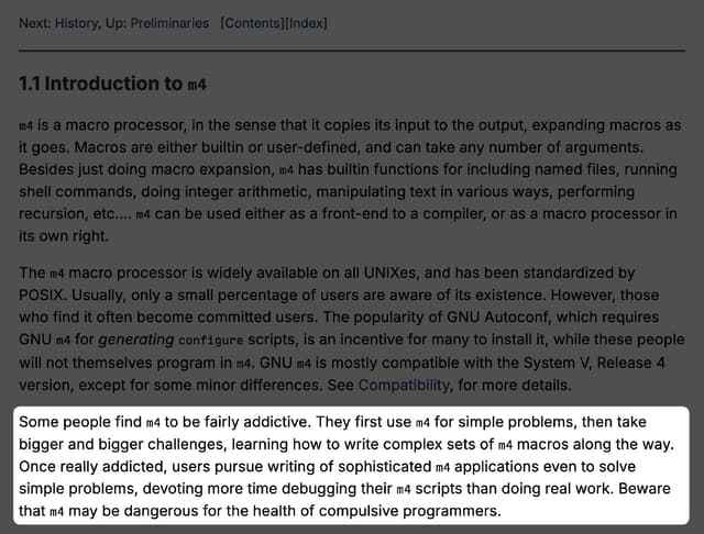Once really addicted, users devot[e] more time debugging their m4 scripts than doing real work. Beware that m4 may be dangerous for the health of compulsive programmers.