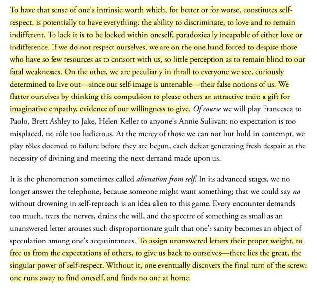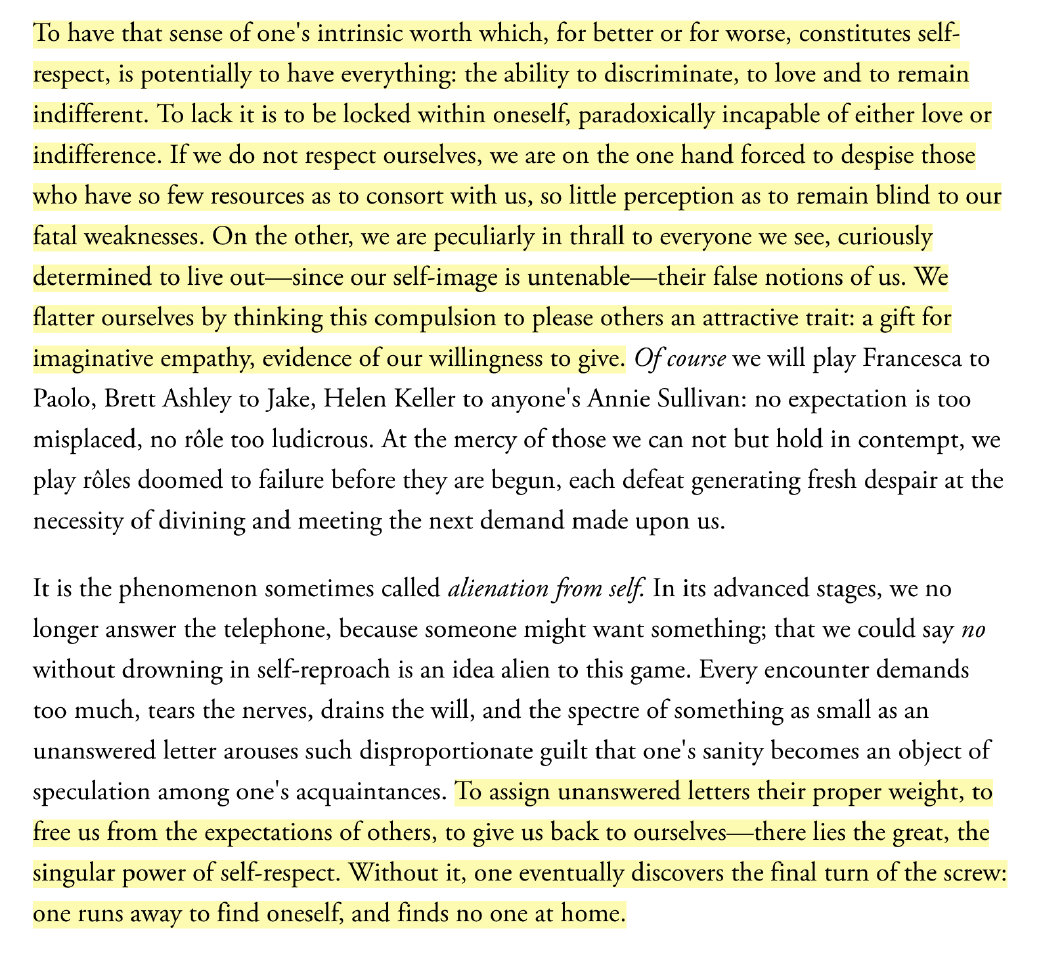 “One runs away to find oneself, and finds no one at home.” https://www.vogue.com/article/joan-didion-self-respect-essay-1961